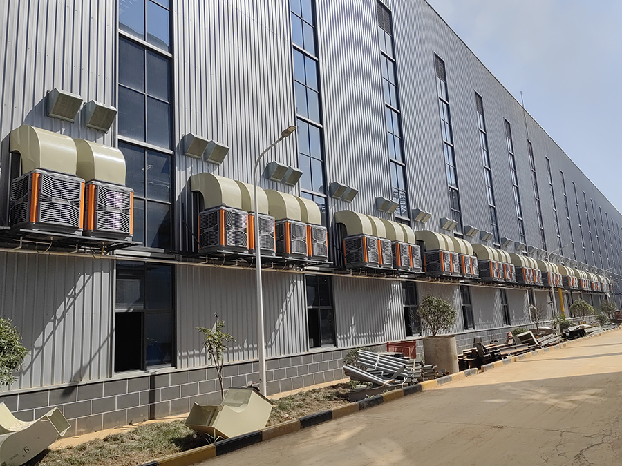 过管道送入车间将室内原有的空气进行置换。车间空间降低4-8度,并且做到良好的通风换气增加空气含氧量的效果,客户对我司产品高度评价!