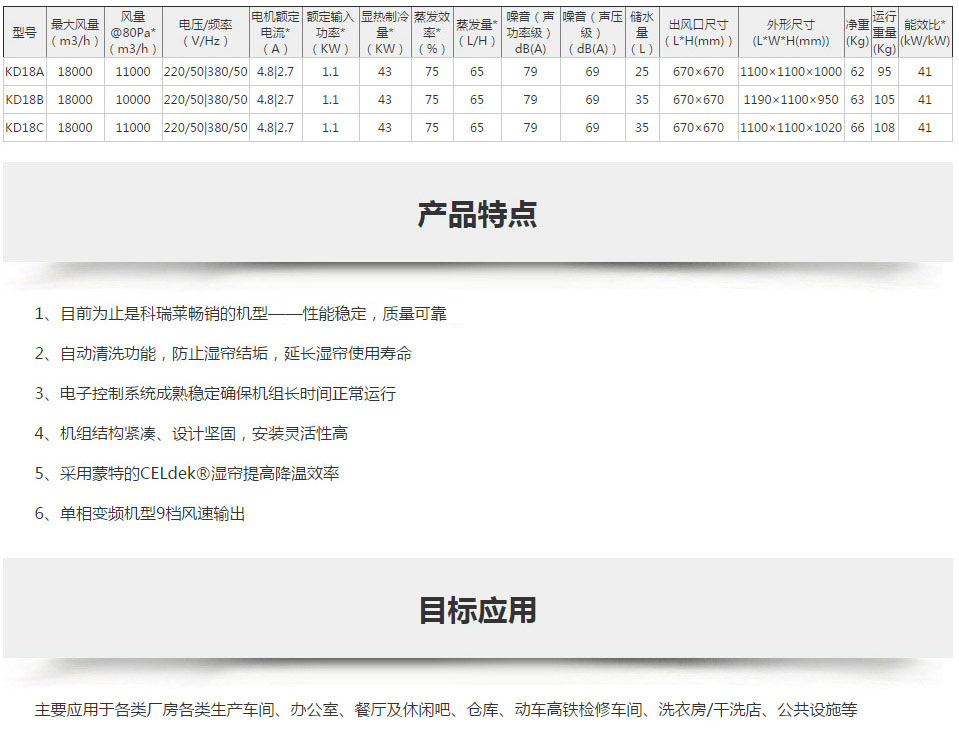 品牌型号:科瑞莱冷风机KD18B 适用面积:130-150平方米 使用范围:工厂车间、饭堂、宿舍、仓储中心、商场、网吧、学校、健身房、汽车4S店、车站、户外活动场所及畜牧业等。