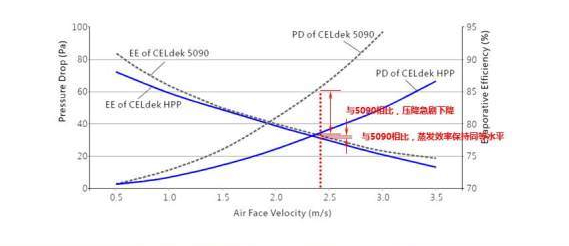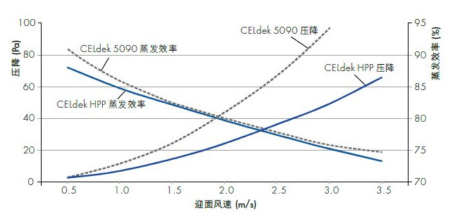 新研发的CELdek®HPP高性能湿帘主要针对迎面风速高、风量大的蒸发式冷风机而设计。对湿帘波纹进行了优化设计的HPP高性能湿帘,在迎面风速高的情况下,能够显著降低压力下降问题,实现卓越蒸发效率。